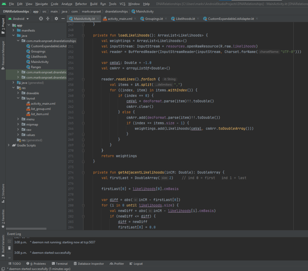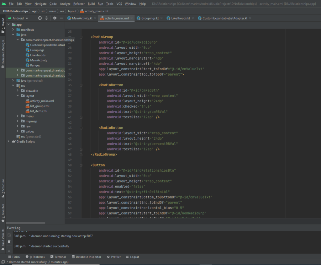 Android Studio is a free software development environment for designing user interfaces and building the code that makes the application run. There are two options for programing the behaviour of the application; Java and Kotlin. Java is a ubiquitous programming language/run time environment. It’s used in loads of modern technology, but it has a longish learning curve. I studied how to use Java just to get the vibe, but ultimately wrote the code in Kotlin. Kotlin leverages Java, but is more modern and is more simplified.