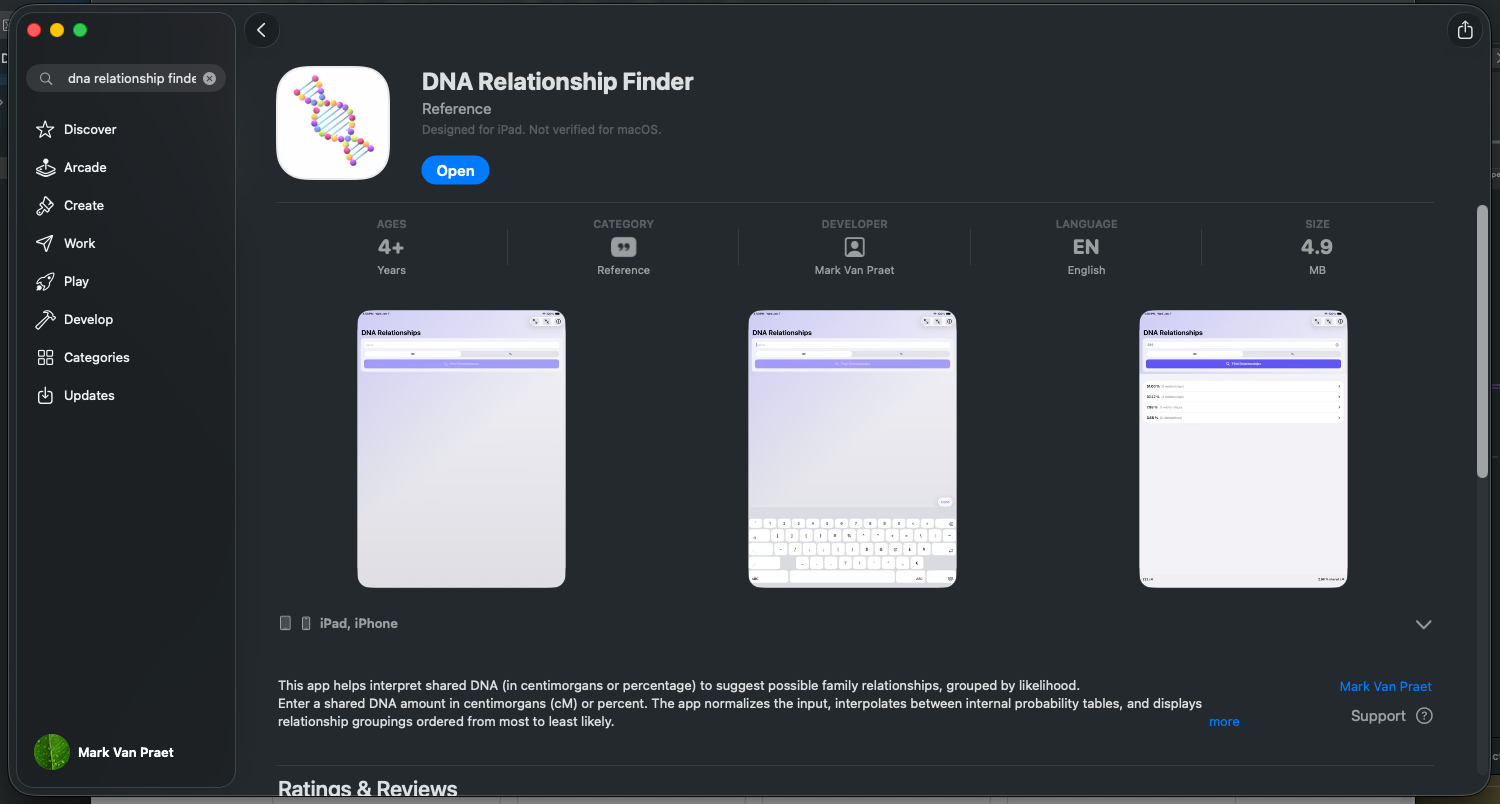 A perfect candidate application came my way through my brother-from-another-mother, and the family’s genealogist, Mark. Through his family tree work, he became an expert on some of the science of describing relationships. He steered me to a website that leverages data from popular DNA matching websites ( like 23-And-Me) to find potential relationship types. Having a mobile version of that website, he noted, would be cool. Perfect!