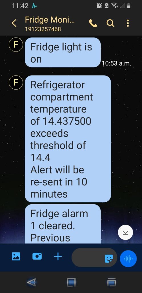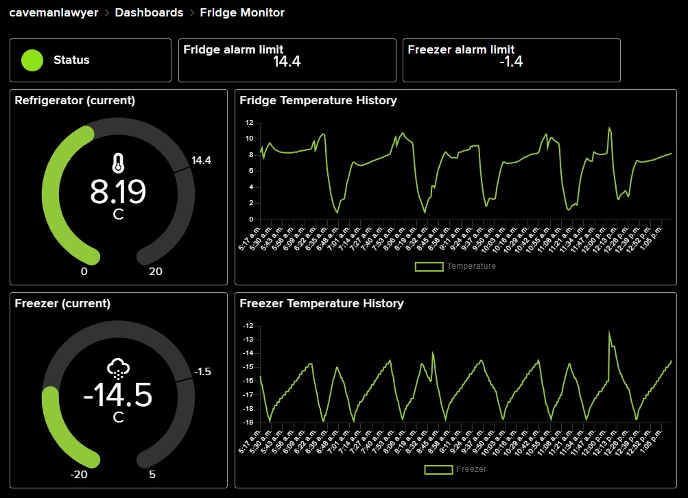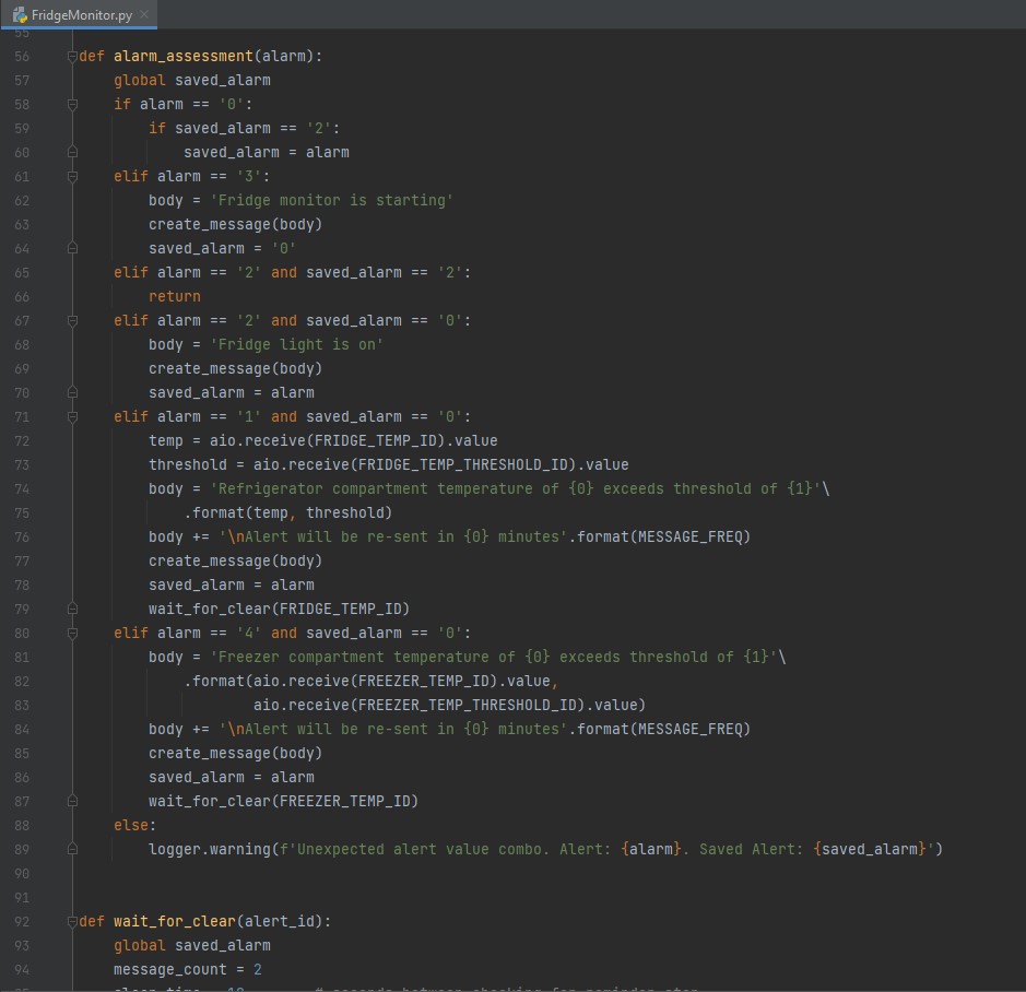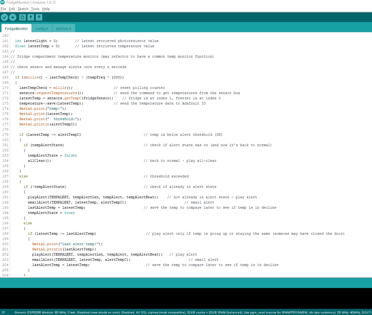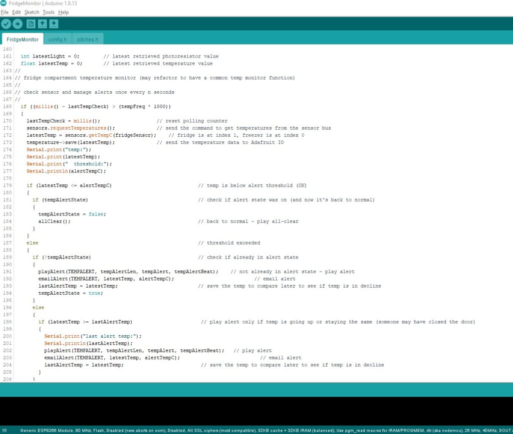 The project revolves around a light-sensitive resistor for knowing when the fridge light is on, and therefore that the door is open, and a pair of temperature sensors to monitor the the fridge and freezer compartments. Data is monitored by the Arduino code over Wifi. Arduino code manages the musical alerts and cloud data management. Python code takes care of the email/text management.