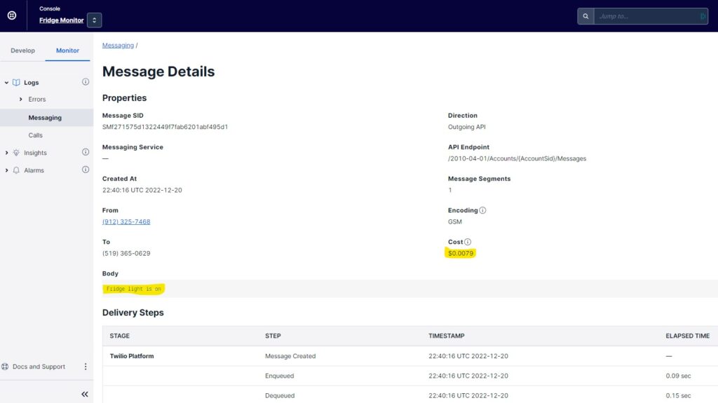 Sending alarm texts is done with a separate process managed by a Python program that I wrote running as a Windows service on my main desktop PC acting as a server. This Python monitor watches the cloud for an alarm being set by the Arduino. Once set, it chucks out a text using the API from a product called Twilio. Twilio is a commercial marketing application, but the price per text is ridiculously low ($.0079/text), so I don’t mind shelling out $20 every few years for some inexpensive peace of mind.