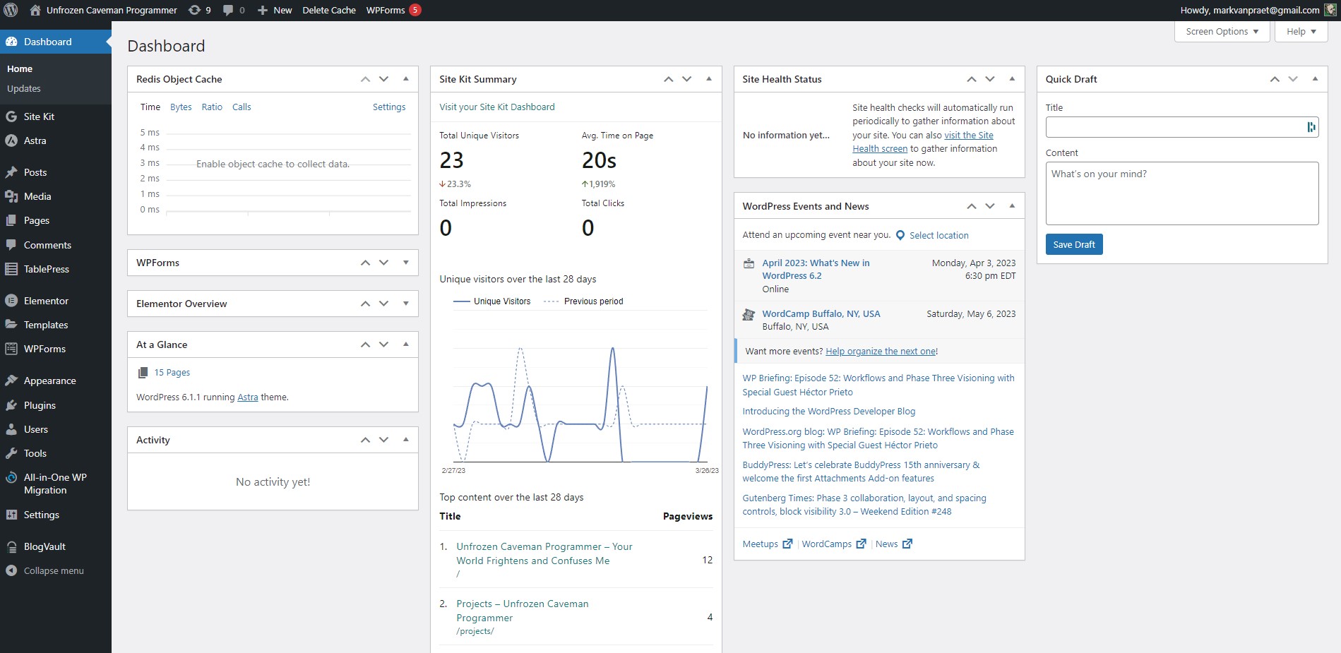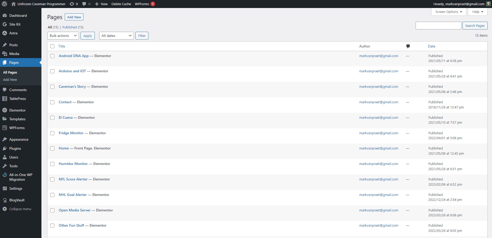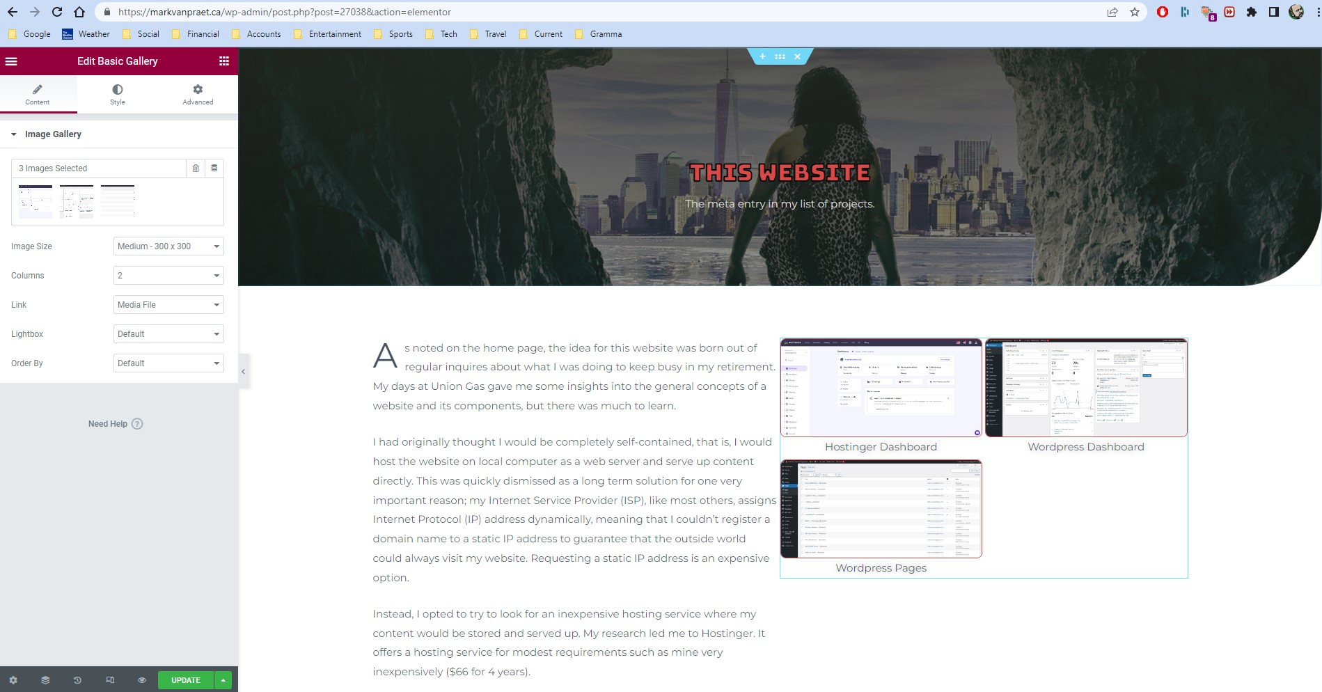 Next, I had to figure out how to construct content, e.g. web pages, links, graphics, media, etc. For this, I opted for WordPress. It’s free for my type of use, and offers a wide variety of authoring tools and themes, and can integrate easily into Hostinger. On top of WordPress, I added Elementor which augments WordPress native capabilities and allows easier and prettier creation of content.