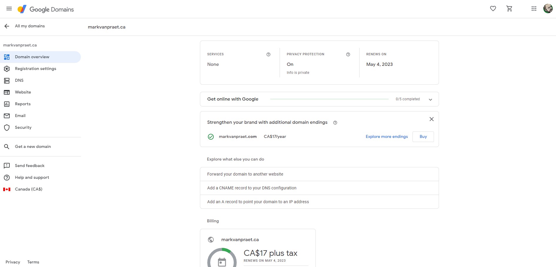 Last but certainly not least, I needed to find and register a domain name. Keeping with the the theme of cheaper is better, I registered markvanpraet.ca through Google Domains for $17/year. Opting for the ‘.com’ extension would have been more money. Plus patriotism.